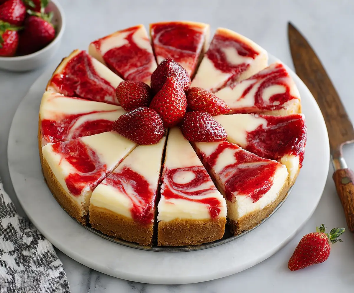 Before you serve this delicious dessert, garnish the top with fresh whole strawberries for a beautiful touch. Your creamy, fruity Strawberry Swirl Cheesecake is now ready to be enjoyed!
