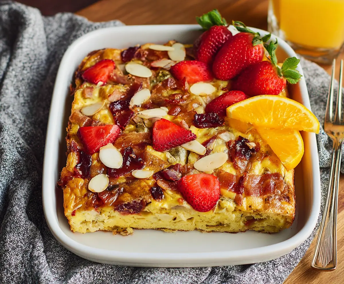 Once baked, remove the casserole from the oven and let it cool slightly before serving. Top with fresh sliced strawberries and a sprinkle of whole nuts for a beautiful finish. Serve warm with a drizzle of maple syrup on top for that extra sweetness!