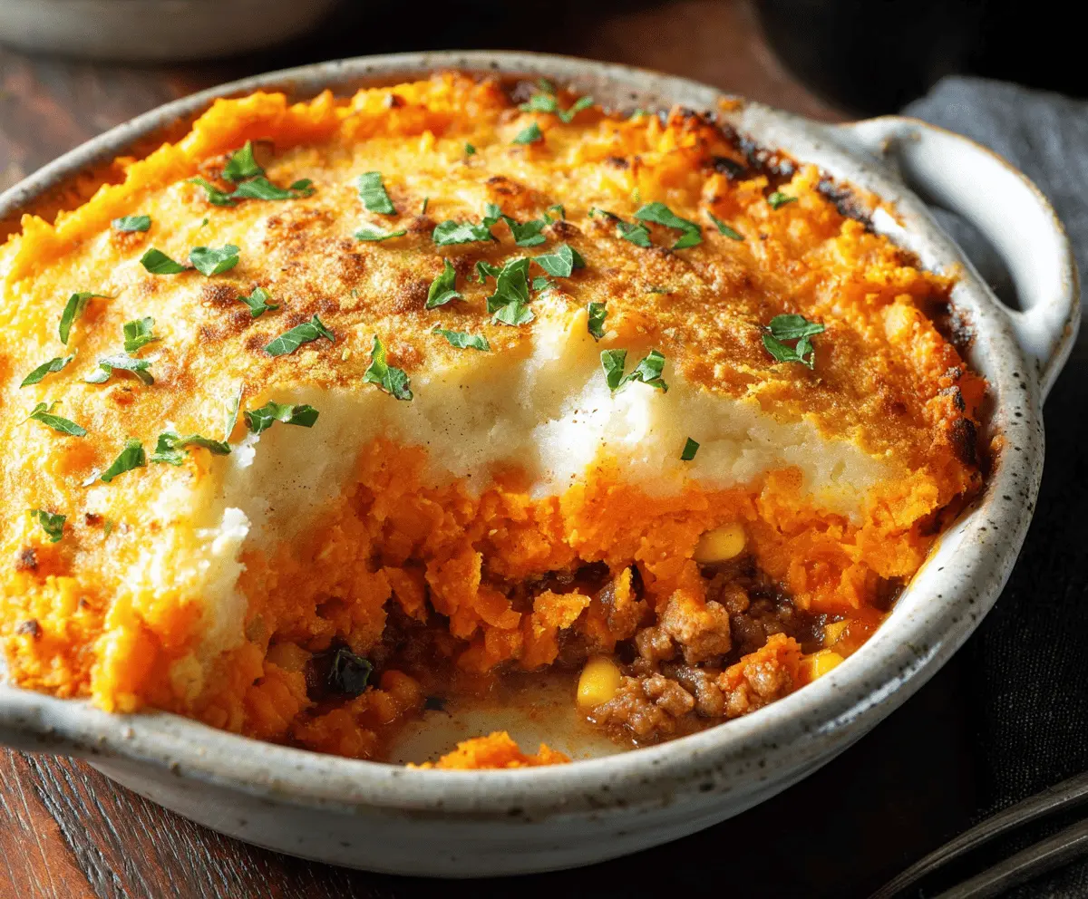 This Sweet Potato Shepherd’s Pie is a cozy dish piled high with fluffy sweet potatoes and a savory filling of veggies and meat. It’s comfort food that warms the heart!