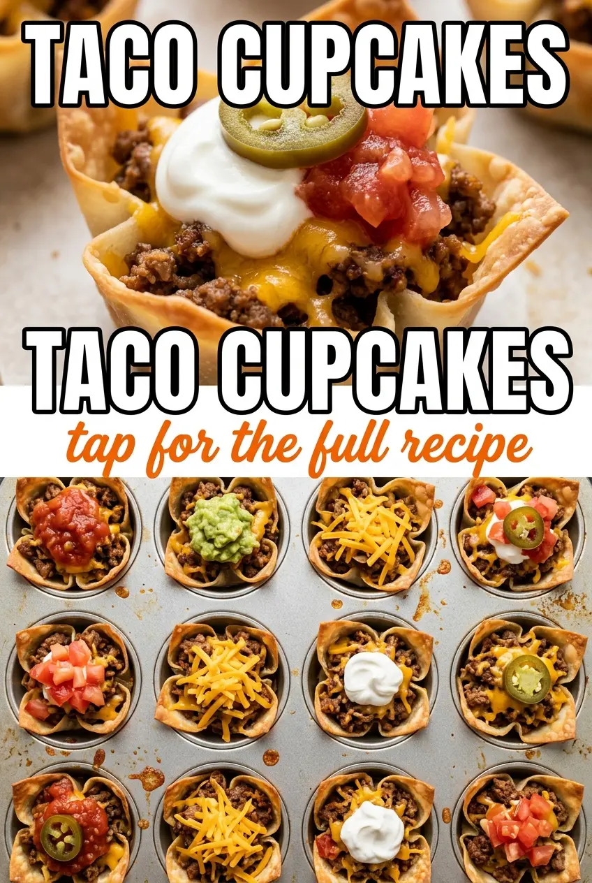 Taco cupcakes are golden crispy wonton or tortilla cups filled with seasoned ground beef, melty cheddar, and fresh toppings. Baked in a muffin tin for finger-food style crunch that stays crisp right after assembly.