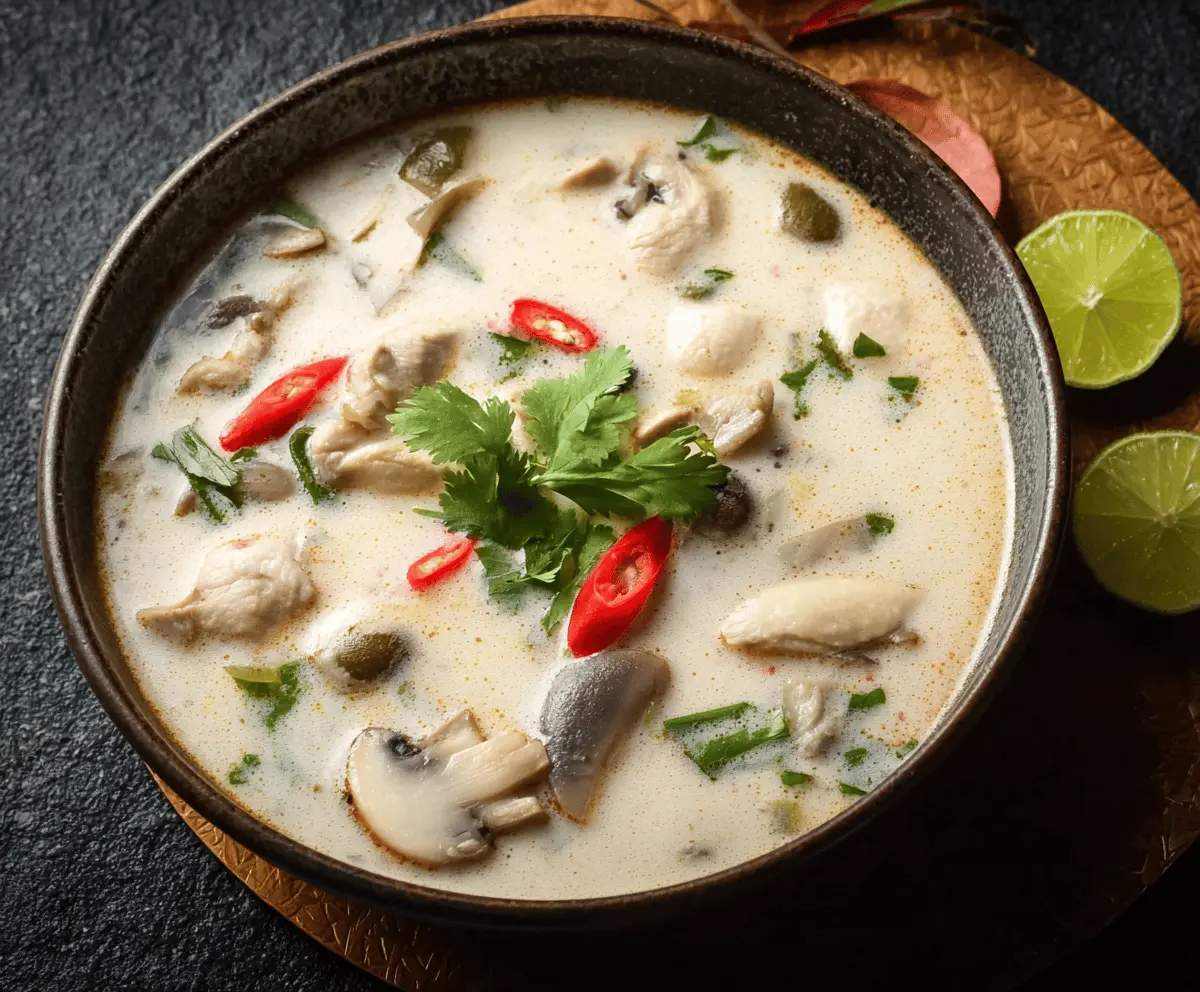 Creamy Tom Kha Gai soup featuring chicken, coconut milk, mushrooms, fresh herbs, and lime slices in a bowl, highlighting authentic Thai flavors.