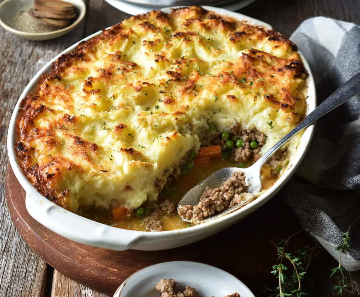 Before serving, garnish your Turkey Shepherd’s Pie with some fresh thyme leaves. It’s ready to be enjoyed—dig in and savor this warm, hearty dish!